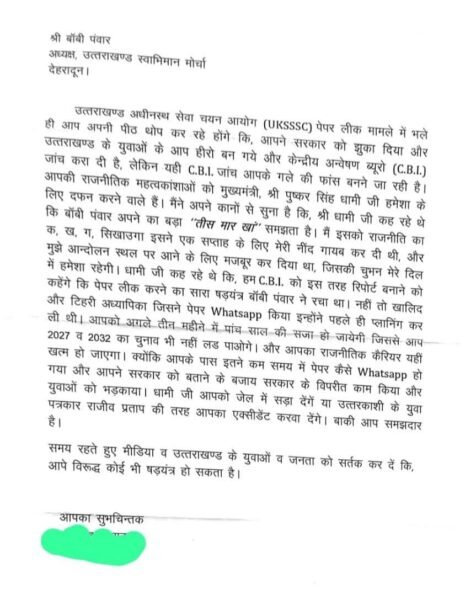 उत्तराखंड: बॉबी पंवार की सोशल मीडिया पोस्ट में सीएम धामी पर सनसनीखेज आरोप…आखिर कौन है चिट्ठी भेजने वाला शुभचिंतक?